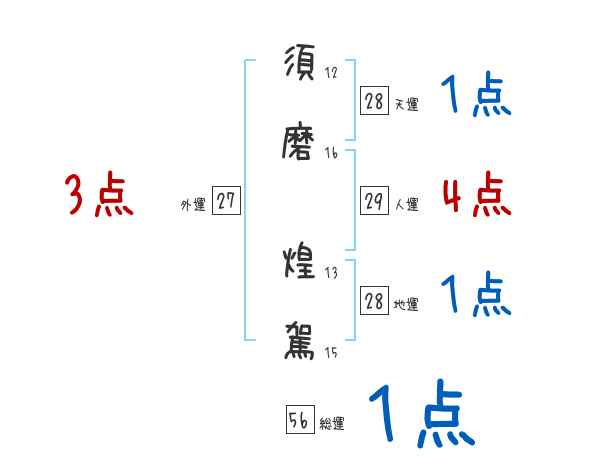 天運![]() | 須磨煌駕さんの天運は28画の1つ星!家庭環境に注意。スポーツで活躍できる能力があるかも。 家系が持つ宿命的な運勢を表します。祖先から受け継いだ苗字ですので自分の力が及びません。家柄を象徴します。 |