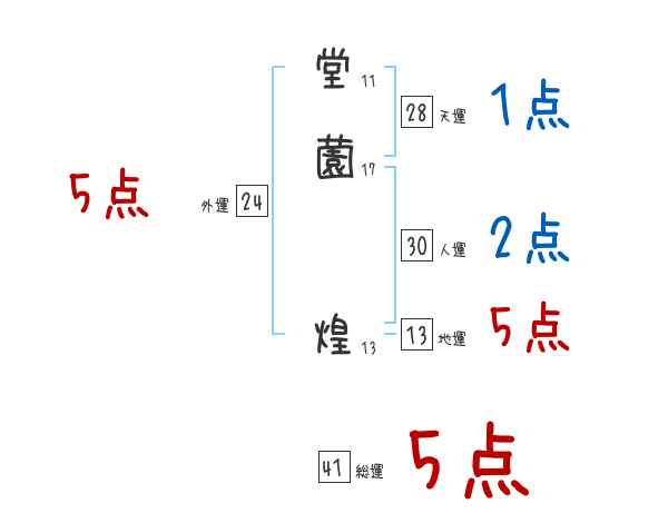 天運![]() | 堂薗煌さんの天運は28画の1つ星!家庭環境に注意。スポーツで活躍できる能力があるかも。 家系が持つ宿命的な運勢を表します。祖先から受け継いだ苗字ですので自分の力が及びません。家柄を象徴します。 |