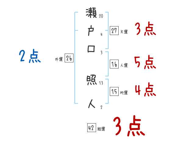 人運![]() | 瀬戸口照人さんの人運は16画の5つ星!人望が厚く大きく発展する。逆転成功が見える。 性格や才能などを表す2番目に重要な運勢です。人間関係や協調性、社会的な成功に影響します。主に20歳から50歳ぐらいまでの中年期の運勢を表します。 |