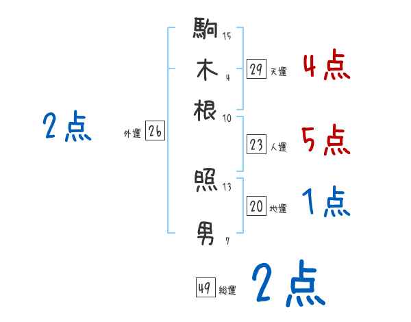 総運![]() | 駒木根照男さんの総運は49画の2つ星!不安定な性格で明暗がある人生。周りの人には支援されやすい。 あなたの人生を表す1番重要な運勢です。生涯を通じて影響する総合運となり、主に50歳以降の晩年期に影響を及ぼします。 |