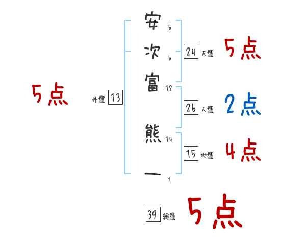 天運![]() | 安次富熊一さんの天運は24画の5つ星!家庭運が良く順調な人生。金運にも恵まれる。 家系が持つ宿命的な運勢を表します。祖先から受け継いだ苗字ですので自分の力が及びません。家柄を象徴します。 |