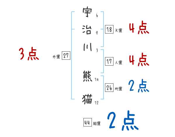 天運![]() | 宇治川熊猫さんの天運は18画の4つ星!情熱的で剛気。忍耐力があり信頼される。 家系が持つ宿命的な運勢を表します。祖先から受け継いだ苗字ですので自分の力が及びません。家柄を象徴します。 |