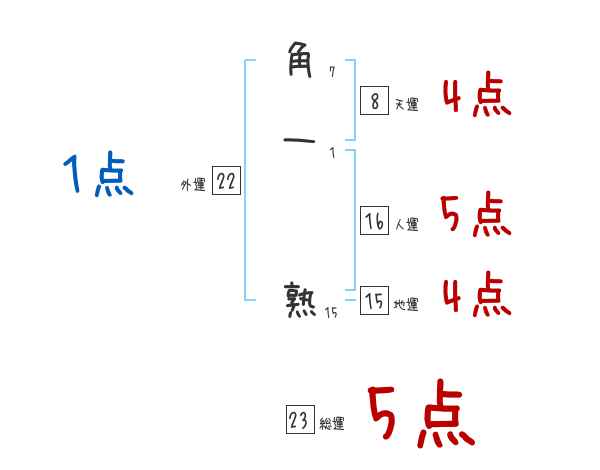 人運![]() | 角一熟さんの人運は16画の5つ星!人望が厚く大きく発展する。逆転成功が見える。 性格や才能などを表す2番目に重要な運勢です。人間関係や協調性、社会的な成功に影響します。主に20歳から50歳ぐらいまでの中年期の運勢を表します。 |