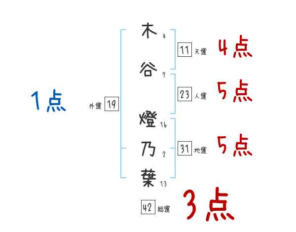 天運![]() | 木谷燈乃葉さんの天運は11画の4つ星!着実に富や地位を得る幸運な人生。 家系が持つ宿命的な運勢を表します。祖先から受け継いだ苗字ですので自分の力が及びません。家柄を象徴します。 |