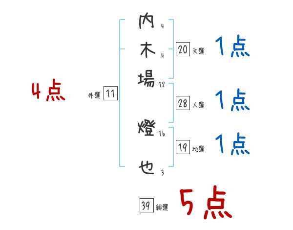 総運![]() | 内木場燈也さんの総運は39画の5つ星!社交性に優れ人望が厚い。人の上に立ち成功する。 あなたの人生を表す1番重要な運勢です。生涯を通じて影響する総合運となり、主に50歳以降の晩年期に影響を及ぼします。 |