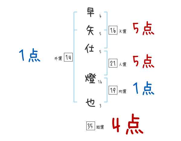 天運![]() | 早矢仕燈也さんの天運は16画の5つ星!人望が厚く大きく発展する。逆転成功が見える。 家系が持つ宿命的な運勢を表します。祖先から受け継いだ苗字ですので自分の力が及びません。家柄を象徴します。 |
