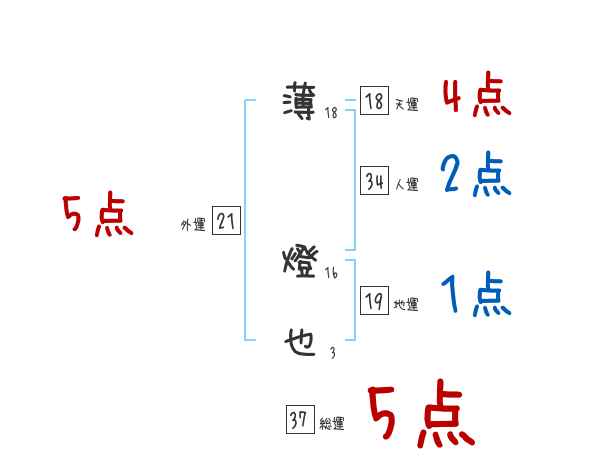 天運![]() | 薄燈也さんの天運は18画の4つ星!情熱的で剛気。忍耐力があり信頼される。 家系が持つ宿命的な運勢を表します。祖先から受け継いだ苗字ですので自分の力が及びません。家柄を象徴します。 |