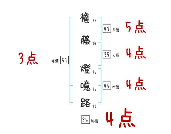 天運![]() | 権藤燈噫路さんの天運は41画の5つ星!大志を抱き、目標に向かって実力を発揮し達成する。温和な性格。 家系が持つ宿命的な運勢を表します。祖先から受け継いだ苗字ですので自分の力が及びません。家柄を象徴します。 |