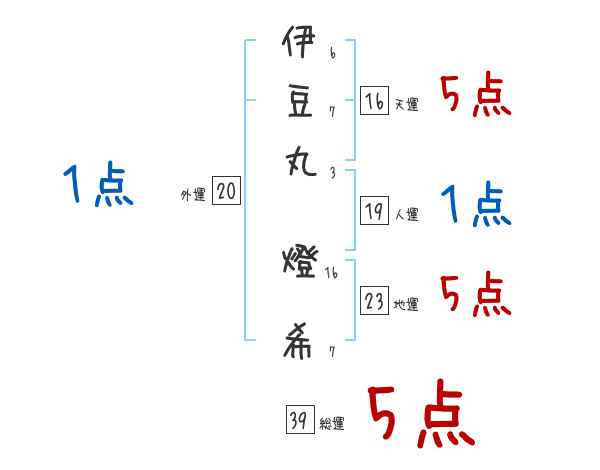 天運![]() | 伊豆丸燈希さんの天運は16画の5つ星!人望が厚く大きく発展する。逆転成功が見える。 家系が持つ宿命的な運勢を表します。祖先から受け継いだ苗字ですので自分の力が及びません。家柄を象徴します。 |
