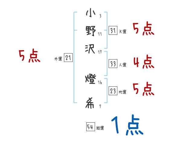 総運![]() | 小野沢燈希さんの総運は54画の1つ星!トラブルが多いかも。周りをよく見て協調して過ごしましょう。 あなたの人生を表す1番重要な運勢です。生涯を通じて影響する総合運となり、主に50歳以降の晩年期に影響を及ぼします。 |