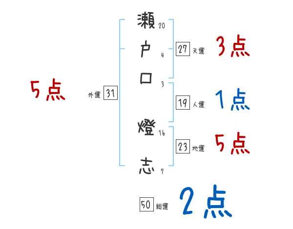 人運![]() | 瀬戸口燈志さんの人運は19画の1つ星!優れた才能を持ちますが、協調性が足りないことも。周りの人と協力する事を意識しましょう。 性格や才能などを表す2番目に重要な運勢です。人間関係や協調性、社会的な成功に影響します。主に20歳から50歳ぐらいまでの中年期の運勢を表します。 |