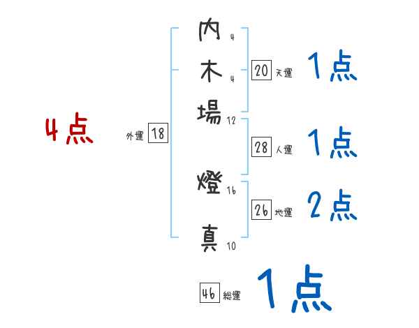 総運![]() | 内木場燈真さんの総運は46画の1つ星!迷走することが多く苦労するかも。目先のことにとらわれないように。 あなたの人生を表す1番重要な運勢です。生涯を通じて影響する総合運となり、主に50歳以降の晩年期に影響を及ぼします。 |