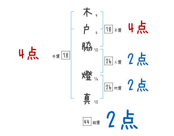 総運![]() | 木戸脇燈真さんの総運は44画の2つ星!誠実で慎重な性格。物事を考えすぎないように注意しましょう。 あなたの人生を表す1番重要な運勢です。生涯を通じて影響する総合運となり、主に50歳以降の晩年期に影響を及ぼします。 |