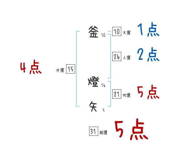 天運![]() | 釜燈矢さんの天運は10画の1つ星!不安を感じやすい傾向。ストレスを抱えないように注意しましょう。 家系が持つ宿命的な運勢を表します。祖先から受け継いだ苗字ですので自分の力が及びません。家柄を象徴します。 |