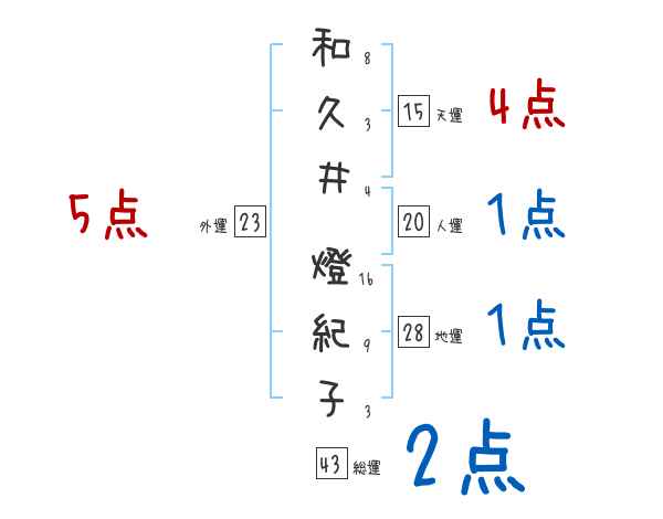 総運![]() | 和久井燈紀子さんの総運は43画の2つ星!頑固な性格で独立心が強いかも。やや非現実的で浪費に注意しましょう。 あなたの人生を表す1番重要な運勢です。生涯を通じて影響する総合運となり、主に50歳以降の晩年期に影響を及ぼします。 |