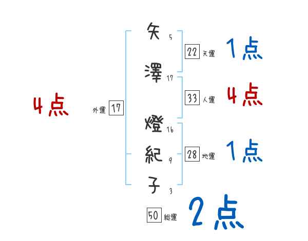 外運![]() | 矢澤燈紀子さんの外運は17画の4つ星!積極的な行動力。地位を気づき財産を手に入れる。純粋な心と直感力。 生活面を象徴する運勢です。外部から受ける影響力を表し、結婚運、家庭運や職場、環境への順応性を表します。 |