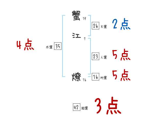 人運![]() | 蟹江燎さんの人運は23画の5つ星!想像力に優れ活力がある。一代で成功し名誉を手に入れる。 性格や才能などを表す2番目に重要な運勢です。人間関係や協調性、社会的な成功に影響します。主に20歳から50歳ぐらいまでの中年期の運勢を表します。 |