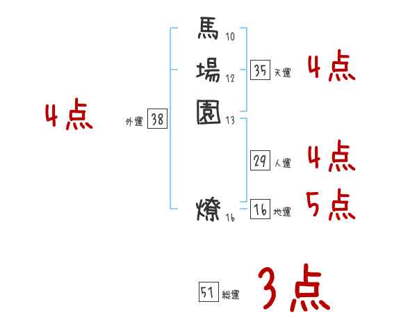 天運![]() | 馬場園燎さんの天運は35画の4つ星!温厚な性格で感受性が高い。穏和な性格で人望が厚い。 家系が持つ宿命的な運勢を表します。祖先から受け継いだ苗字ですので自分の力が及びません。家柄を象徴します。 |