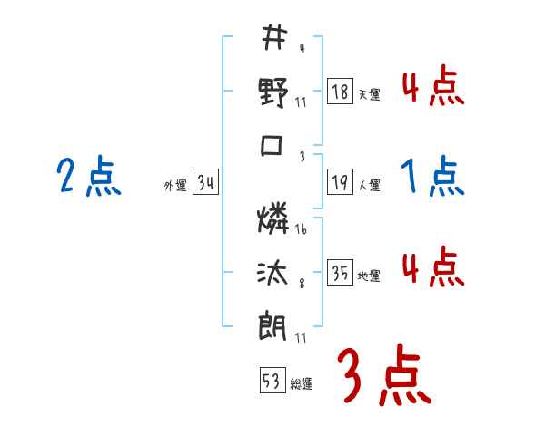 天運![]() | 井野口燐汰朗さんの天運は18画の4つ星!情熱的で剛気。忍耐力があり信頼される。 家系が持つ宿命的な運勢を表します。祖先から受け継いだ苗字ですので自分の力が及びません。家柄を象徴します。 |