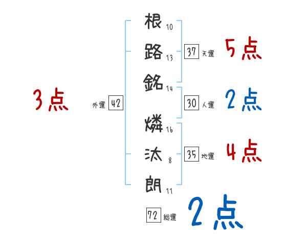 総運![]() | 根路銘燐汰朗さんの総運は72画の2つ星!災難が多く不安定な生活にならないように注意。明暗のある人生かも。 あなたの人生を表す1番重要な運勢です。生涯を通じて影響する総合運となり、主に50歳以降の晩年期に影響を及ぼします。 |