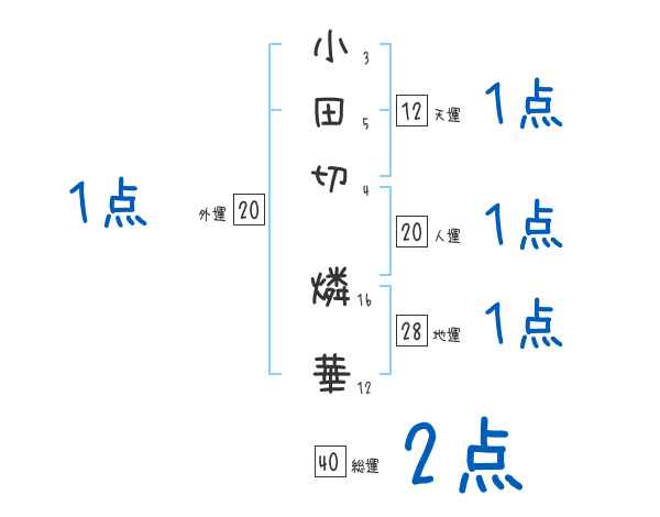 天運![]() | 小田切燐華さんの天運は12画の1つ星!簡単な失敗で諦めてしまいやすいかも。着実に行動すると良いでしょう。 家系が持つ宿命的な運勢を表します。祖先から受け継いだ苗字ですので自分の力が及びません。家柄を象徴します。 |