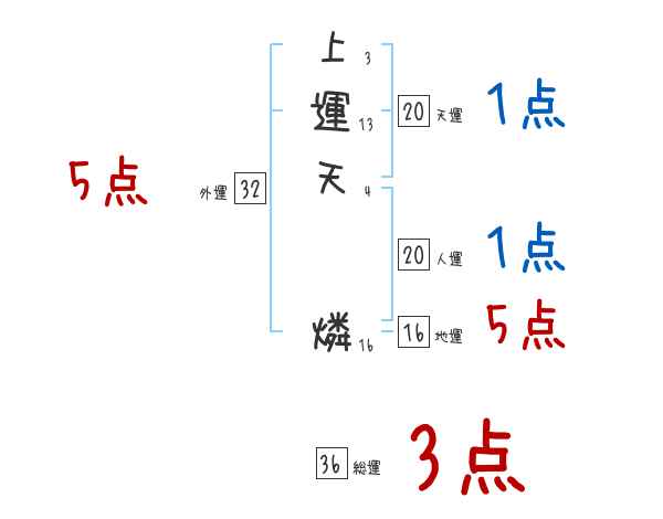外運![]() | 上運天燐さんの外運は32画の5つ星!柔軟性があり成功する。チャンスが多く金運が良い。 生活面を象徴する運勢です。外部から受ける影響力を表し、結婚運、家庭運や職場、環境への順応性を表します。 |