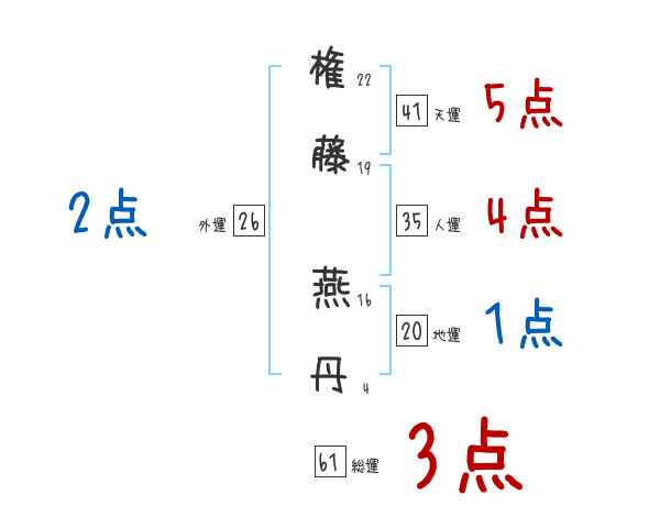 天運![]() | 権藤燕丹さんの天運は41画の5つ星!大志を抱き、目標に向かって実力を発揮し達成する。温和な性格。 家系が持つ宿命的な運勢を表します。祖先から受け継いだ苗字ですので自分の力が及びません。家柄を象徴します。 |