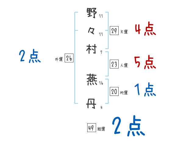 天運![]() | 野々村燕丹さんの天運は29画の4つ星!完全主義で才能がある。厳格な心の持ち主。 家系が持つ宿命的な運勢を表します。祖先から受け継いだ苗字ですので自分の力が及びません。家柄を象徴します。 |