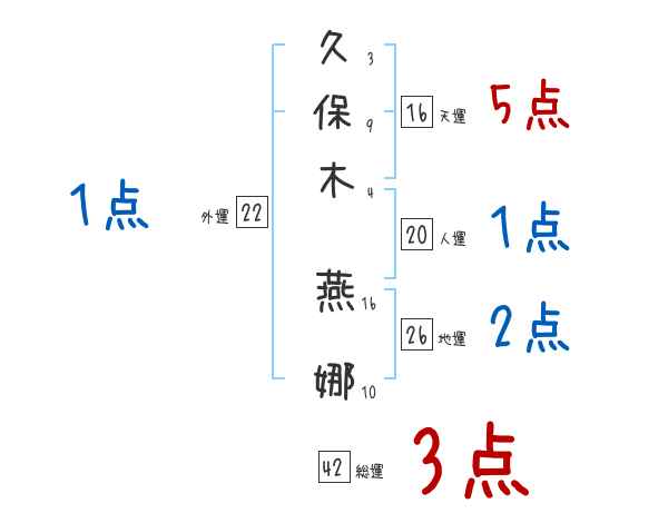 天運![]() | 久保木燕娜さんの天運は16画の5つ星!人望が厚く大きく発展する。逆転成功が見える。 家系が持つ宿命的な運勢を表します。祖先から受け継いだ苗字ですので自分の力が及びません。家柄を象徴します。 |