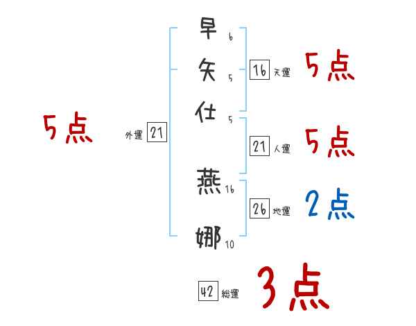 天運![]() | 早矢仕燕娜さんの天運は16画の5つ星!人望が厚く大きく発展する。逆転成功が見える。 家系が持つ宿命的な運勢を表します。祖先から受け継いだ苗字ですので自分の力が及びません。家柄を象徴します。 |