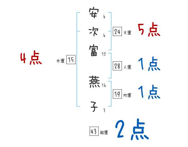 天運![]() | 安次富燕子さんの天運は24画の5つ星!家庭運が良く順調な人生。金運にも恵まれる。 家系が持つ宿命的な運勢を表します。祖先から受け継いだ苗字ですので自分の力が及びません。家柄を象徴します。 |