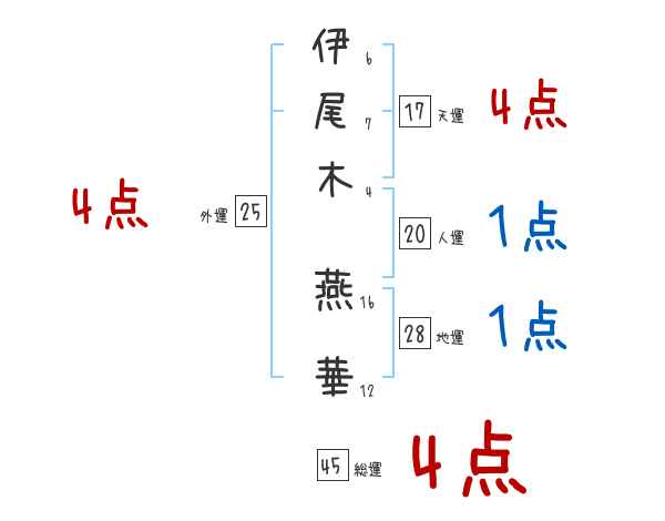 総運![]() | 伊尾木燕華さんの総運は45画の4つ星!もくもくと物事を進め達成する。地味な努力家。 あなたの人生を表す1番重要な運勢です。生涯を通じて影響する総合運となり、主に50歳以降の晩年期に影響を及ぼします。 |