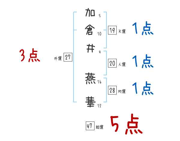 総運![]() | 加倉井燕華さんの総運は47画の5つ星!実力が開花し発展する円満な人生。財に恵まれる。 あなたの人生を表す1番重要な運勢です。生涯を通じて影響する総合運となり、主に50歳以降の晩年期に影響を及ぼします。 |