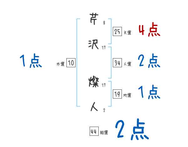 総運![]() | 芹沢燦人さんの総運は44画の2つ星!誠実で慎重な性格。物事を考えすぎないように注意しましょう。 あなたの人生を表す1番重要な運勢です。生涯を通じて影響する総合運となり、主に50歳以降の晩年期に影響を及ぼします。 |
