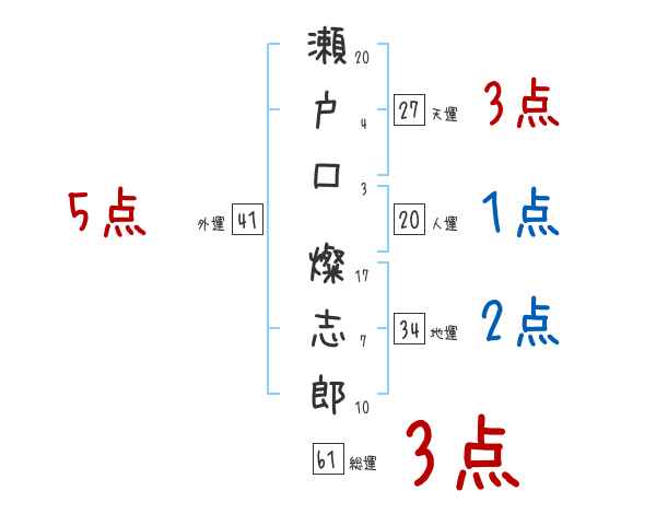 天運![]() | 瀬戸口燦志郎さんの天運は27画の3つ星!頭脳明晰だが強情で摩擦が多い傾向。孤立に注意。 家系が持つ宿命的な運勢を表します。祖先から受け継いだ苗字ですので自分の力が及びません。家柄を象徴します。 |