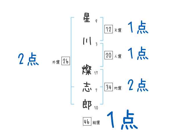 外運![]() | 星川燦志郎さんの外運は26画の2つ星!波瀾万丈かも。信頼できる人を大事にしましょう。 生活面を象徴する運勢です。外部から受ける影響力を表し、結婚運、家庭運や職場、環境への順応性を表します。 |
