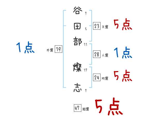 | 総運  | 谷田部燦志さんの総運は47画の5つ星!実力が開花し発展する円満な人生。財に恵まれる。あなたの人生を表す1番重要な運勢です。生涯を通じて影響する総合運となり、主に50歳以降の晩年期に影響を及ぼします。 |