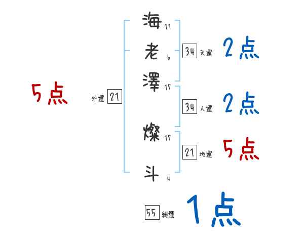 外運![]() | 海老澤燦斗さんの外運は21画の5つ星!統率力がある。独立し成功する。名誉を手に入れる。 生活面を象徴する運勢です。外部から受ける影響力を表し、結婚運、家庭運や職場、環境への順応性を表します。 |