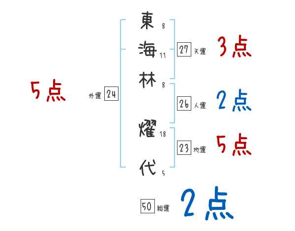 総運![]() | 東海林燿代さんの総運は50画の2つ星!浮き沈みが激しく不安定。しりすぼみに衰退しやすいので注意しましょう。 あなたの人生を表す1番重要な運勢です。生涯を通じて影響する総合運となり、主に50歳以降の晩年期に影響を及ぼします。 |