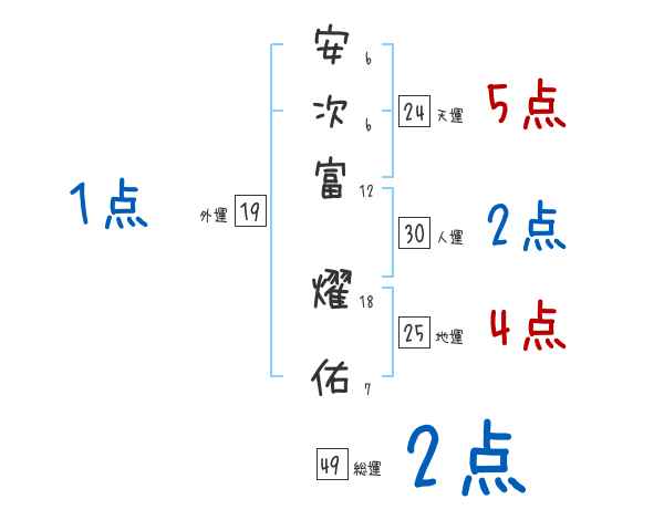 天運![]() | 安次富燿佑さんの天運は24画の5つ星!家庭運が良く順調な人生。金運にも恵まれる。 家系が持つ宿命的な運勢を表します。祖先から受け継いだ苗字ですので自分の力が及びません。家柄を象徴します。 |