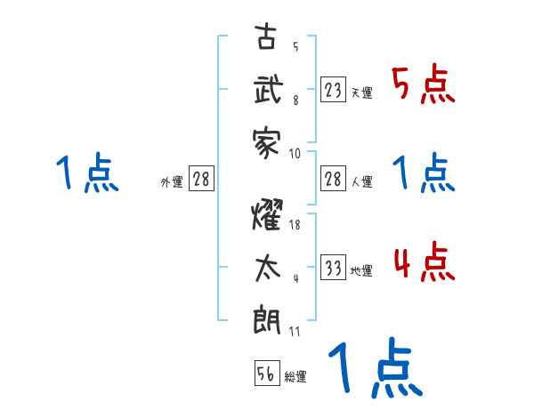 天運![]() | 古武家燿太朗さんの天運は23画の5つ星!想像力に優れ活力がある。一代で成功し名誉を手に入れる。 家系が持つ宿命的な運勢を表します。祖先から受け継いだ苗字ですので自分の力が及びません。家柄を象徴します。 |