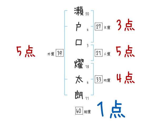 外運![]() | 瀬戸口燿太朗さんの外運は39画の5つ星!社交性に優れ人望が厚い。人の上に立ち成功する。 生活面を象徴する運勢です。外部から受ける影響力を表し、結婚運、家庭運や職場、環境への順応性を表します。 |