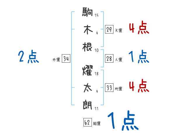 天運![]() | 駒木根燿太朗さんの天運は29画の4つ星!完全主義で才能がある。厳格な心の持ち主。 家系が持つ宿命的な運勢を表します。祖先から受け継いだ苗字ですので自分の力が及びません。家柄を象徴します。 |
