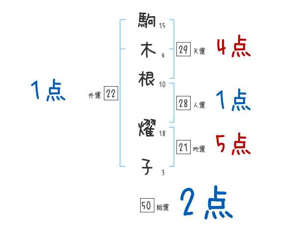総運![]() | 駒木根燿子さんの総運は50画の2つ星!浮き沈みが激しく不安定。しりすぼみに衰退しやすいので注意しましょう。 あなたの人生を表す1番重要な運勢です。生涯を通じて影響する総合運となり、主に50歳以降の晩年期に影響を及ぼします。 |