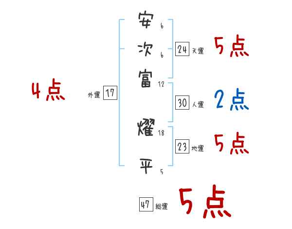 天運![]() | 安次富燿平さんの天運は24画の5つ星!家庭運が良く順調な人生。金運にも恵まれる。 家系が持つ宿命的な運勢を表します。祖先から受け継いだ苗字ですので自分の力が及びません。家柄を象徴します。 |