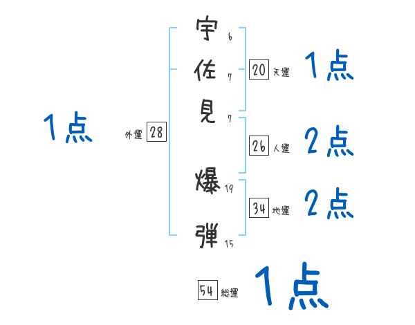 地運![]() | 宇佐見爆弾さんの地運は34画の2つ星!独創性に優れるが、自尊心が強く災難に注意しましょう。 個性を表す基礎的な運勢です。性格形成や対人関係、行動力など家庭環境に影響されます。主に誕生してから20歳くらいまでの若年期の運勢を表します。 |