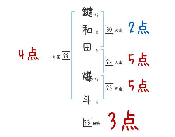 総運![]() | 鍵和田爆斗さんの総運は53画の3つ星!やや見栄っ張りで虚栄心がある。散財に注意。 あなたの人生を表す1番重要な運勢です。生涯を通じて影響する総合運となり、主に50歳以降の晩年期に影響を及ぼします。 |