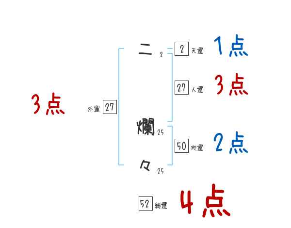 外運![]() | 二爛々さんの外運は27画の3つ星!頭脳明晰だが強情で摩擦が多い傾向。孤立に注意。 生活面を象徴する運勢です。外部から受ける影響力を表し、結婚運、家庭運や職場、環境への順応性を表します。 |