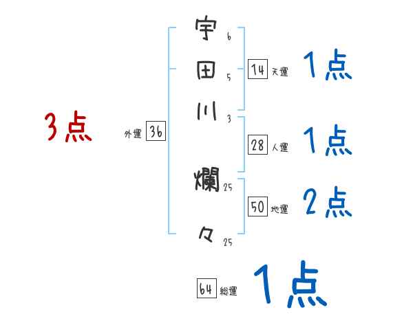 天運![]() | 宇田川爛々さんの天運は14画の1つ星!人に対して優しいがストレスを溜め込みがち。人間関係のトラブルを避けるよう気をつけましょう。 家系が持つ宿命的な運勢を表します。祖先から受け継いだ苗字ですので自分の力が及びません。家柄を象徴します。 |