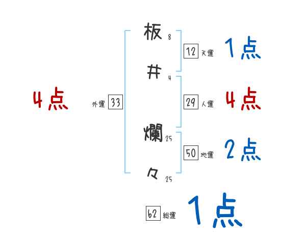 天運![]() | 板井爛々さんの天運は12画の1つ星!簡単な失敗で諦めてしまいやすいかも。着実に行動すると良いでしょう。 家系が持つ宿命的な運勢を表します。祖先から受け継いだ苗字ですので自分の力が及びません。家柄を象徴します。 |